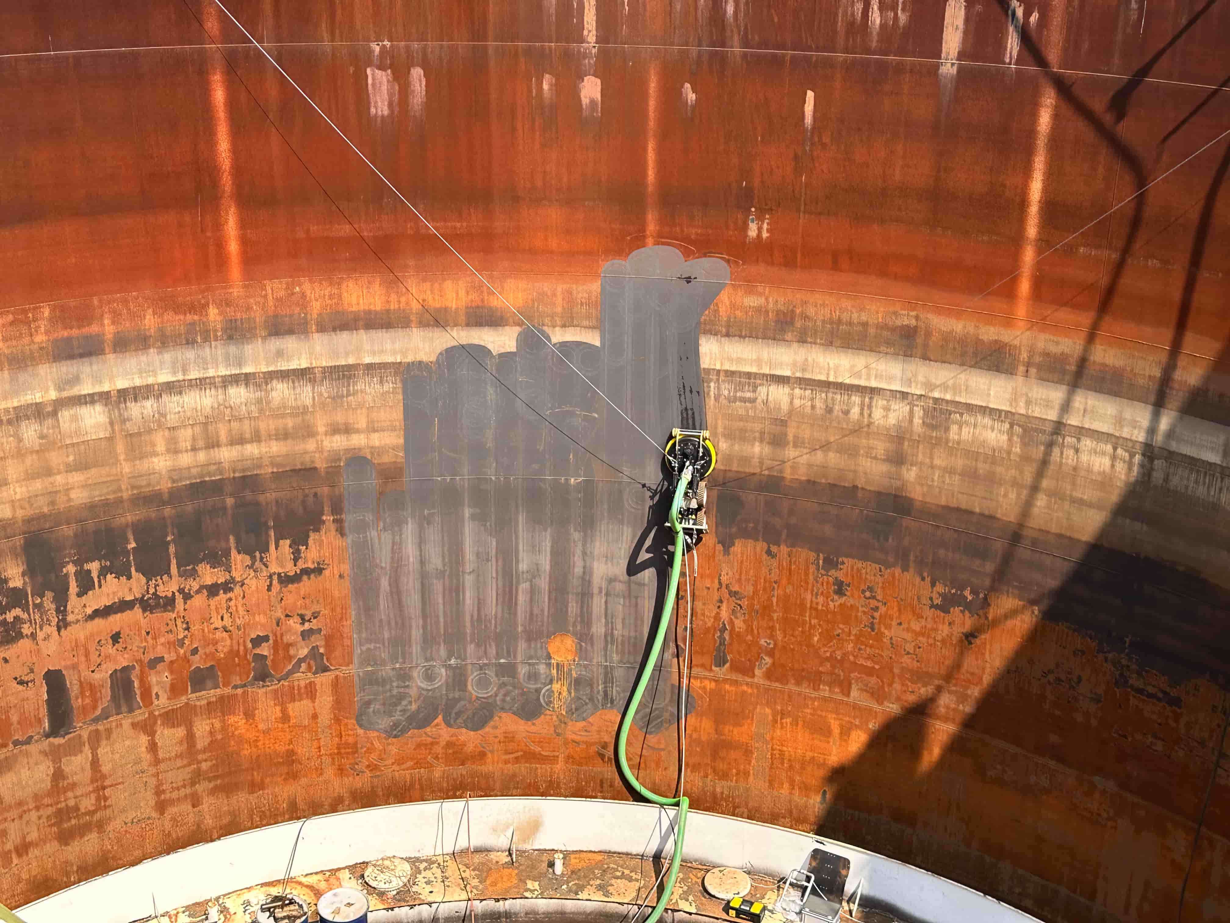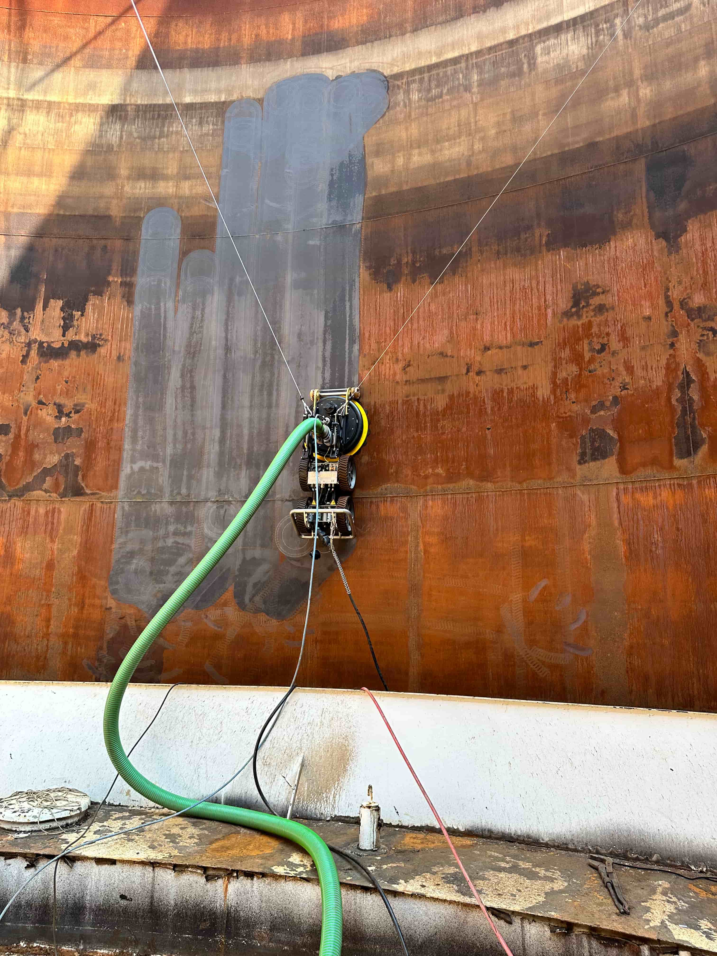 Il sistema sospeso permette una pulizia completa e uniforme delle superfici interne del serbatoio, raggiungendo aree difficilmente accessibili con metodi tradizionali. Il robot è dotato di getti ad alta pressione e può essere controllato da remoto, garantendo la massima sicurezza per gli operatori.
